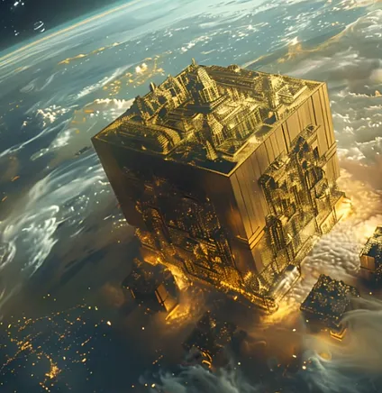 The New Jerusalem is an orbital megastructure approximately the size of the Moon. Maybe it is the moon, disassembled by post-singularity technology and reconstructed into a massive arcology: there is a suggestive similarity between their sizes [4]. Depending on population density, a cube of this size could hold somewhere around a quadrillion people, or a million times the current world population.