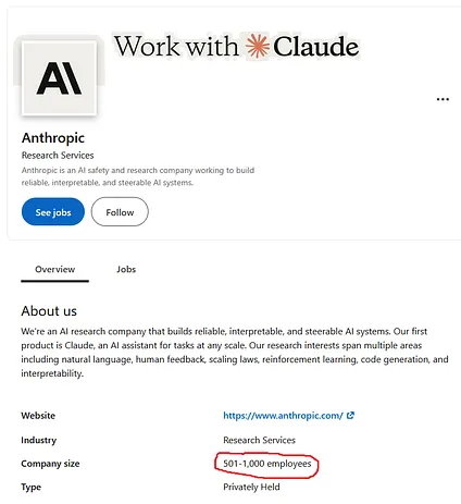 What is the headcount of Anthropic? I can’t find a precise answer, but here’s their LinkedIn page: