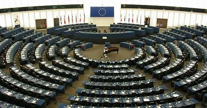 In what sense is “the moon under her feet”? In her role as President, von der Leyen stands above, and frequently addresses, the European Parliament, which looks like this: